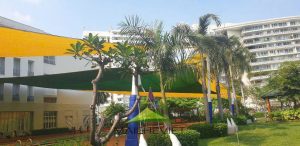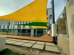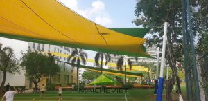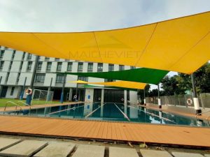 Mái che trường Đinh Thiện Lý tại Quận 7 TPHCM do Havico thực hiện với chất liệu bạt căng chuyên dụng bền đẹp, giúp làm mát khu vực hồ bơi, sân chơi đa năng, sân thể thao,…ngăn chặn ánh nắng, các tia UV và thời tiết mưa nhỏ bảo vệ làn da cho học sinh…