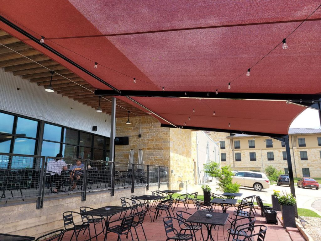 • Mái che cánh buồm giúp ngăn chặn ánh nắng gay gắt, làm giảm nhiệt độ bên dưới mái che, tạo không gian thưởng thức ẩm thực mát mẻ và thoải mái cho thực khách.