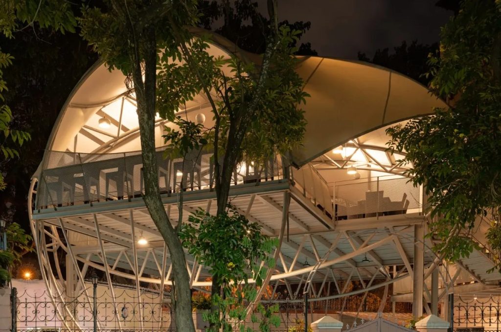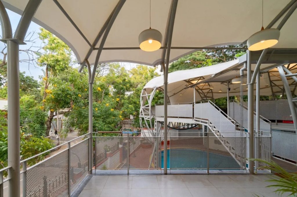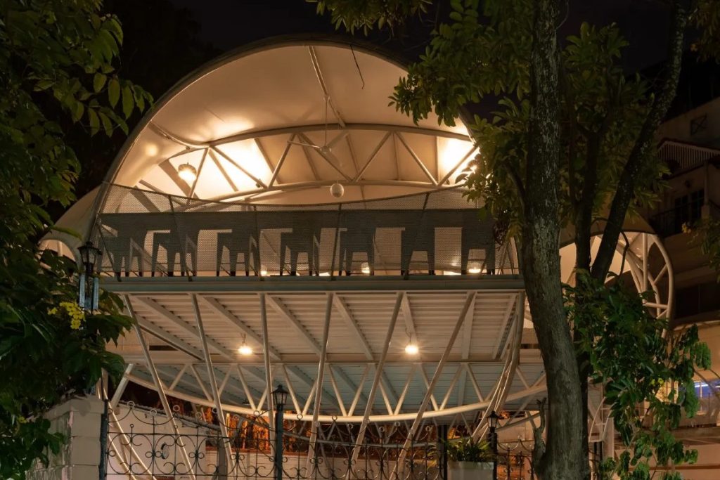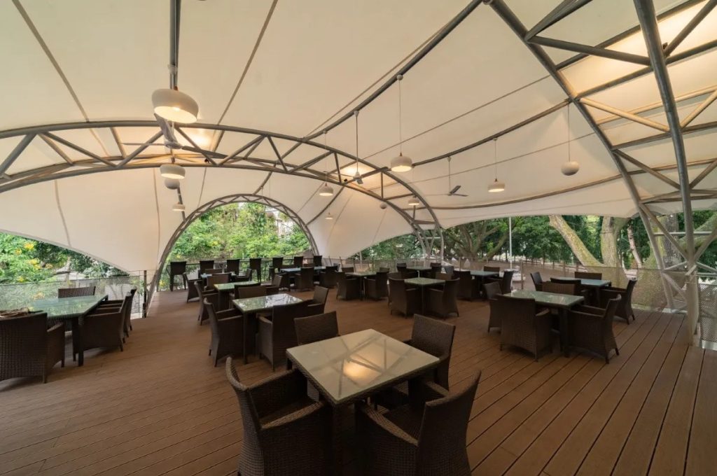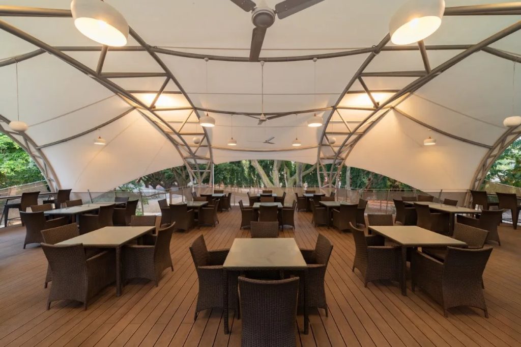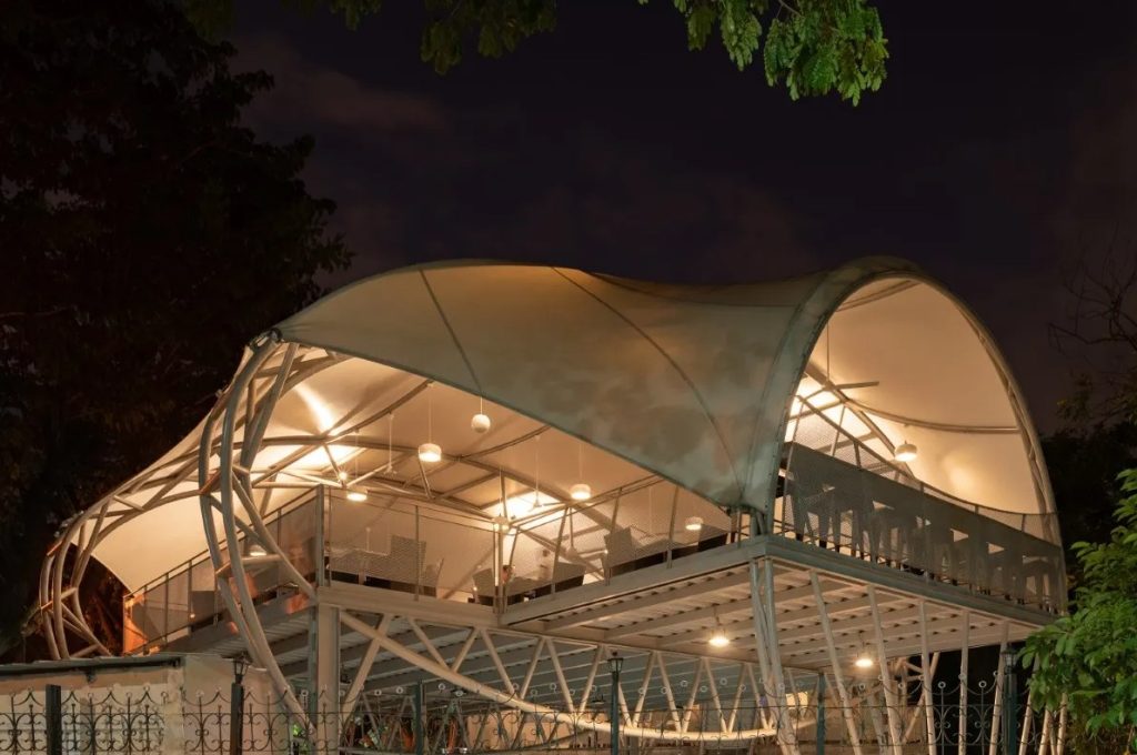 Thiết kế bán mở tận dụng thông gió tự nhiên, ánh sáng khuếch tán qua lớp mái vải, tạo nên trải nghiệm không gian linh hoạt và giàu cảm xúc. Với chỉ 22 tấn thép sử dụng, công trình thể hiện rõ tư duy tối giản kết cấu nhưng vẫn đảm bảo hiệu quả kỹ thuật.