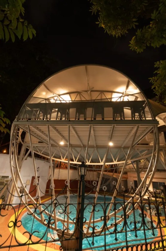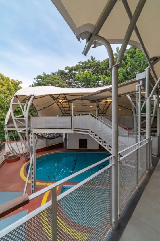 Vì vậy, thép và vải căng là lựa chọn hợp lý: nhẹ, dễ lắp đặt, tạo được nhịp lớn mà không ảnh hưởng nhiều đến hồ bơi bên dưới.