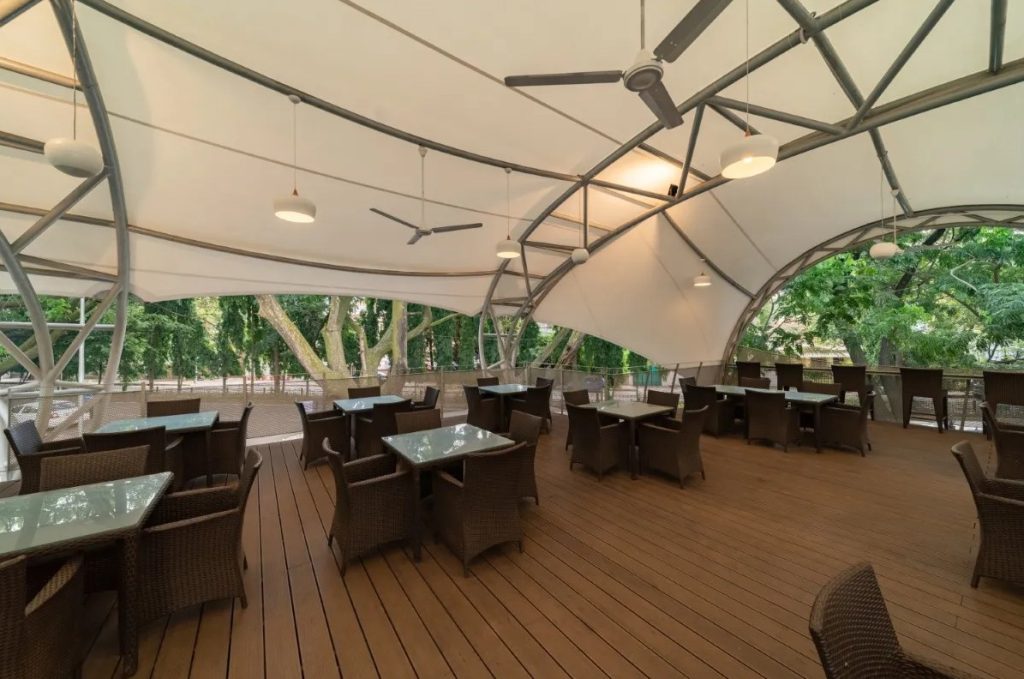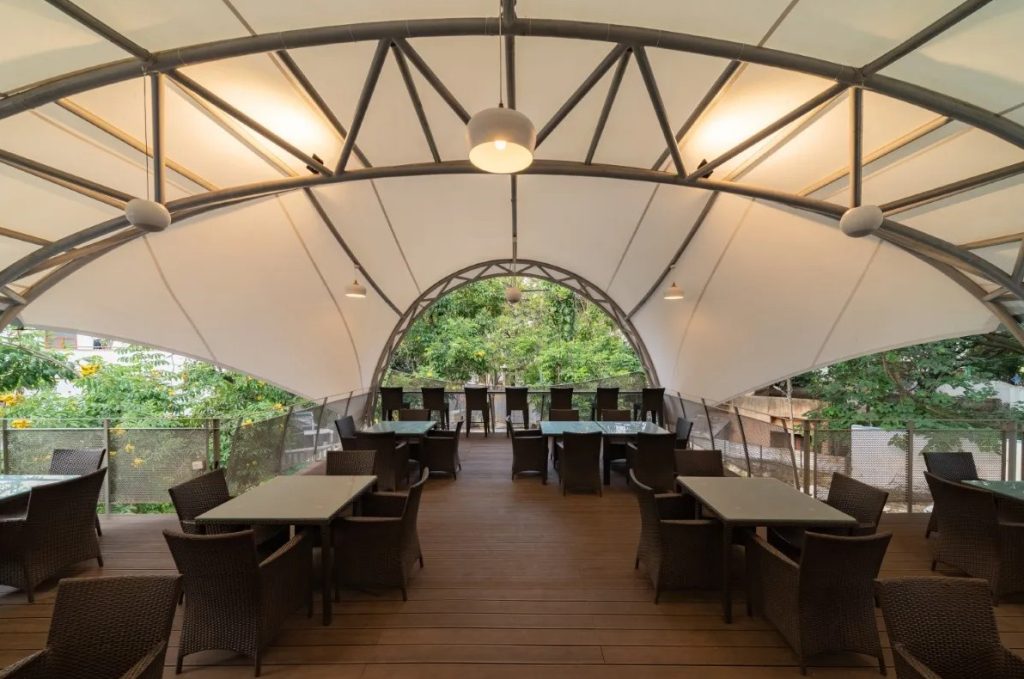 Trong điều kiện quỹ đất hạn chế của RMV Club, bài toán đặt ra là mở rộng khu vực ăn uống mà không làm gián đoạn hoạt động hiện hữu. Giải pháp được lựa chọn là một mái che màng căng cho nhà hàng bán mở đặt ngay phía trên hồ bơi hiện có – một quyết định táo bạo nhưng hợp lý về mặt không gian.