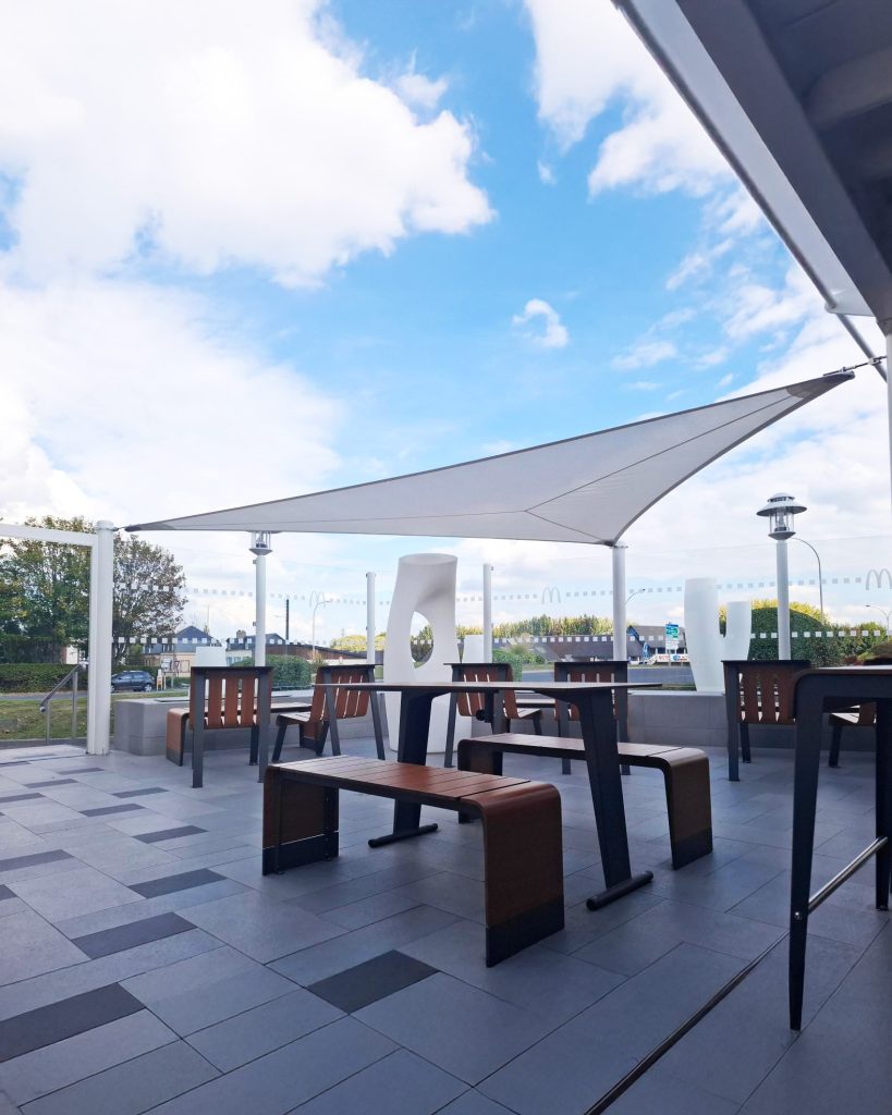 Chọn màu mái che cùng tông với quán ăn giúp tạo sự thống nhất về thẩm mỹ, mang lại vẻ ngoài chuyên nghiệp, hài hòa và bắt mắt hơn. Ngoài ra, việc lựa chọn màu sắc còn ảnh hưởng đến tâm lý khách hàng, màu sắc sáng sủa có thể tạo cảm giác thoáng đãng, sạch sẽ và thu hút khách hơn trong khi màu tối giúp chống nắng tốt hơn nhưng có thể tạo cảm giác ngột ngạt.